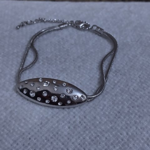 Hopean värinen teräs rannekoru jossa ihania vaaleanpunaisia ja violetteja "timantteja"