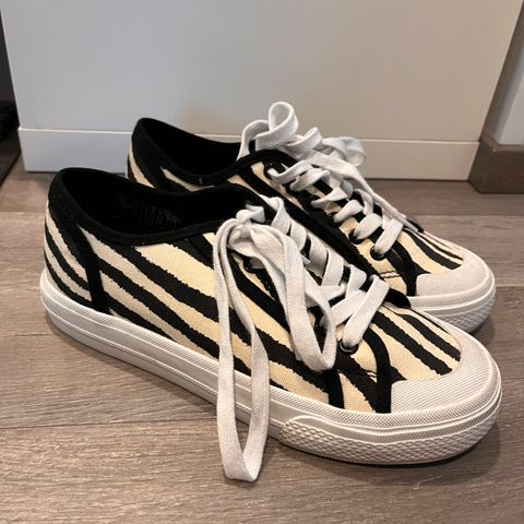 Muutaman kerran käytössä olleet tennarit. Muuten lähes uudenveroiset, pieni tahra toisessa kengässä (näkyy kuvassa). En ole kokeillut tahranpoistoa.