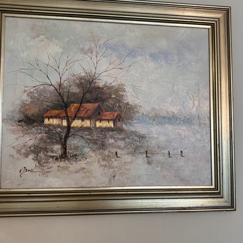 Maalaus on 29/30 vuonna 1962 tehty. Maalaus esittää liperin maalaishenkistä maisemaa. Väritettynä radikaalilla violetilla.