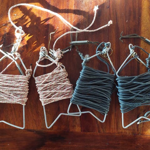 9 Kappaletta iskukoukkua sekä osassa langat ja kelalla lisää.