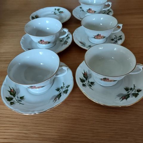 Kahvikuppeja ja pullalautasia 17 kpl. Kupin vetoisuus 1,5 dl. Puolalaista posliinia. Nouto Tirilästä.