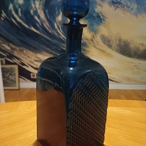 Riihimäen Lasi, Nanny Stillin iso vihreä Flindari karahvi 60-luvulta, korkeus 27 cm, hyväkuntoinen ilman korkkia