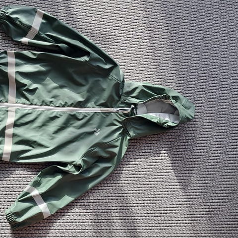 Pieneen tilaan kätevästi menevä sadetakki. Koko merkintä 134-140, meillä ollut käytössä ~128 kokoisten vaatteiden kanssa samaan aikaan. Nimikoitu.