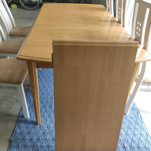 Iskun mallistoa: Täyspuinen jatkettava pyökkipöytä 170x90 cm. Tästä voi vielä pidentää; jatkopala 60 cm. Tuolit myyty, pöydän hinta 100€.