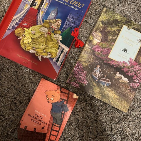 Kirjat ovat 15e per yhdessä kuvassa näkyvät kaikki kirjat, muutoin 2e kpl ja satukirjat 5e. Postilla en lähetä alle 10e ostoja.