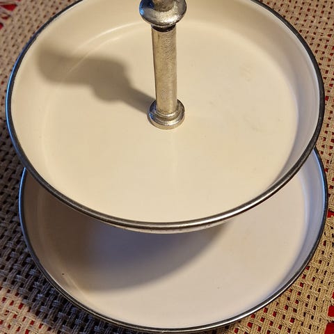RM Sweets & treads - kerrostarjotin, uudenveroinen, posliini, valkoinen väri. Mitat: korkeus 25 cm, alempi lautanen 15 cm, ylempi lautanen 12,5 cm