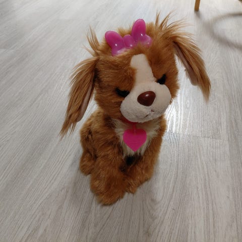 Myydään lelu. Koira kävelee, heiluttaa häntäänsä ja laulaa.