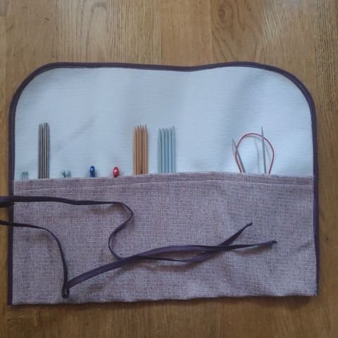 Itse tehty käyttämätön puikkokotelo sukkapuikoille ja virkkuukoukuille. Tehty jämäkästä kankaasta. Kuvan puikot ja koukut ei eivät tule mukana.