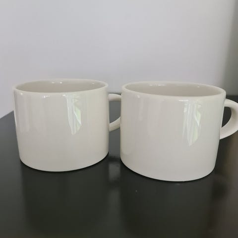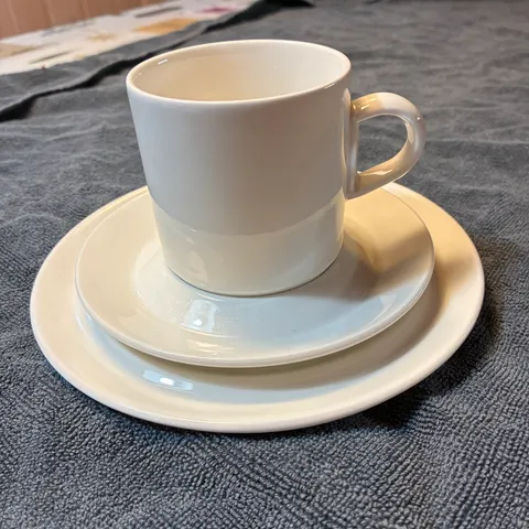Myydään loistokuntoinen valkoinen Arabian Moreeni-kuppisetti. Koristeltu ohuella sinisellä reunuksella. Kupin korkeus 6cm ja leveys 9cm. Tassilla leveyttä on 16cm. Suunnittelija on Heikki Orvola 1992-1996.