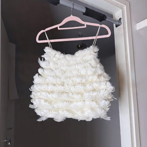 Puku on pesty, mutta kaipaa paremman höyrytyksen/silityksen säilytyksen jäljiltä. Muutama pieni langanveto saattaa löytyä, mutta ei näy käytössä.