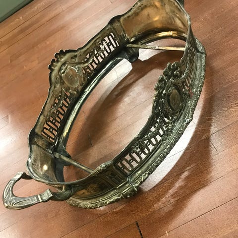 Jalallinen rypälekoristeltu tarjoiluvati. Vati on tinattu ja se on näyttävä lisä kodin sisustukseen esimerkiksi hedelmien säilytykseen.