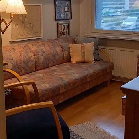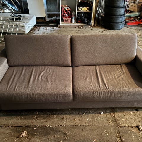 Tukeva, siniharmaa vuodesohva,. Puurunko, jousitus ehjä ja hyvä.Nukkumisleveys n 120 cm.. Annetut mitat noin-mittoja. Tarvitsee kaksi kantajaa. Vain nouto