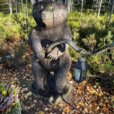 Karhu hunajapurkilla käsin veistetty puufiguuri, Karjala