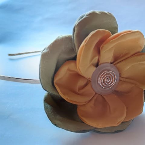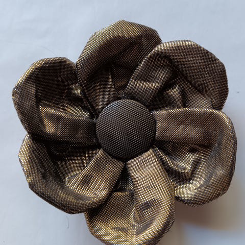 Kangaskukka tehty sinivalkoisesta vanhasta kukkakankaasta, keskellä nappi.