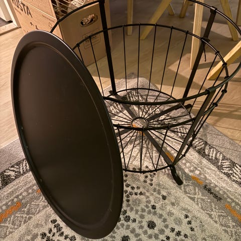 Pyöreä pöytä hyllyllä. korkeus 65 cm. Vaatii maalauksen . Erittäin tanakka kun on täyttä puuta. Tarjoa ja hae pois.