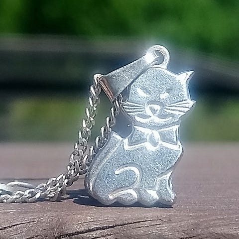 Hopeinen kissariipus ketjulla. Riipuksessa valmistajan leima (B9) sekä yhteen.