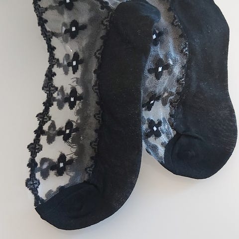 Kauniit joustavalla pitsillä ylhäällä pysyvät stay up sukat. Pitsistä remmit sukkaat. Hoikalle jalalle. Kuvasta poiketen yläpitsi ei ole punainen vaan musta