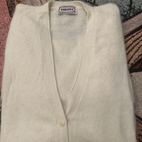Luonnonvaalean ja persikan sävyinen harvinainen käsinkudottu angora villatakki.