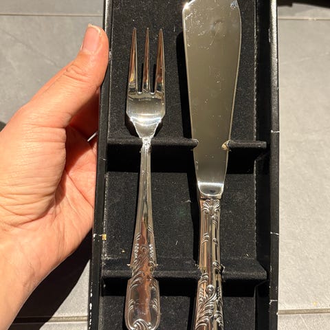 Lähes käyttämättömät hopeiset kakkuveitsi ja haarukka.