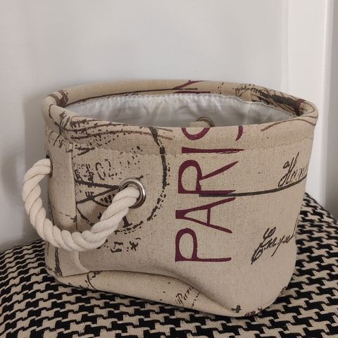 Myydään kuvassa näkyvät pyöreä pikkuliina ja kangaskori (kulmat sidotaan yhteen nauhoilla). Liinan halkaisija 45cm ja korin 27cm.