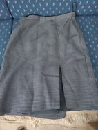 Sinivalkoinen vuorillinen "minihame". Pituus 53 cm. Toisessa ilmoituksessa tähän kuuluva pitkä jakku. Merkki suomalainen PTA.