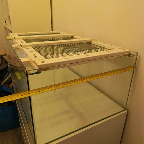 Vaan nyt huoli pois! Tästäpä kertaheitolla ratkaisu ongelmiin. Akvaariosta nätisti tehty terraario, johon vipeltäjät kotiutuvat oivasti. Strategiset mitat tälle: 193 (p) x96 (s) x 128 (k). Päällä kaksi keskeltä kiinni olevaa ja avautuvaa, sirpakkaa verkko-ovea.
