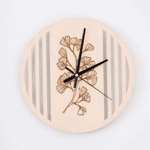 Kello puisessa kehyksessä, jossa edessä lasi. Kuvassa Volvon bussi ja neljä rekkaa.