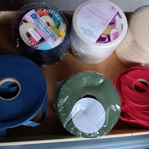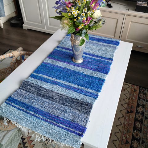 Mustaan kalalankaloimeen kangaspuissa kudottu poppanakangas. Idea oli tehdä tästä pöytä tabletteja, mutta on jäänyt/unohtunut kaappiin. Poppanassa on kaksi raporttia, jotka on rajattu keltaisella kuderaidalla. Kankaan leveys on 100 cm ja pituus 2 x 37 cm. Tästä voi tehdä myös tyynyjä tai kasseja ym. Nouto Tesomalta sovitusti tai postitus jolloin postikulut ostajalle, myös ToriDiili käy.