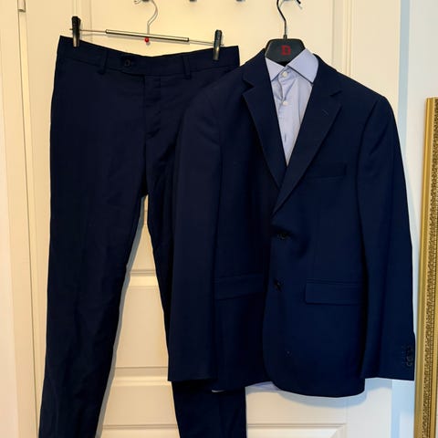 Hoikalla urheilijapojalla rippipukuna ollut ja käytön jälkeen pesulassa pesetetty ja prässätty polyester/viskoosi-Dressman BasicLine-puku, koko B170