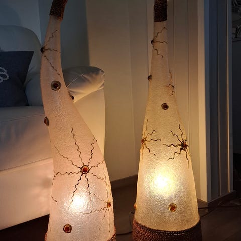 Lattiavalaisimet x 2, reilun metrin korkeita kuusikulmaisia, joissa tähtikuviot, mistä valo loistaa tunnelmallisesti läpi. Valaisimet saa purettua, jolloin voi maalata rungon haluamansa väriseksi esim spray-maalilla. Tavallinen lamppu sopii. Nämä ovat talviset tähtikuviot, ei siis pelkästään jouluvalo. Näissä jalalla kätevästi painettava katkaisija kuten jalkalampuissa, kuvissa tarkemmin. Yhteishinta 25e. Kannattaa katsoa myös muut ilmoitukseni.