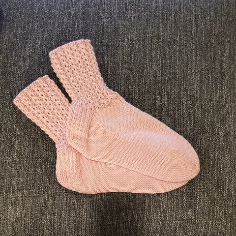 Nilkkapituiset vaaleanpunaiset villasukat tummanpunaisella kirjavuudella. Koko n. 40-41, lanka 75% villaa ja 25% polyamidia.