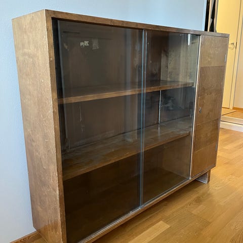Puinen lasivitriini, jossa on useita hyllyjä ja kaksi alalaatikkoa. Yksi lasi haljennut.