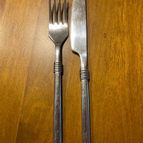 Vanhat aterimet käytetyssä kunnossa, ei tietoa valmistajasta. Veitset eivät ole teräviä.