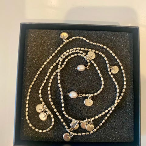 Hopeaa, jossa vaaleanpunaisia helmiä. Pituus 80 cm.