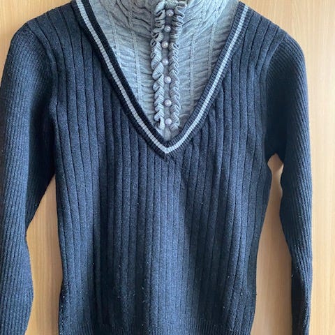 Puuvillasta erilainen” villapusero”jossa molemmissa kainalosta helmaan on kivasti auki.Takaosa hieman pidempi.Koko M