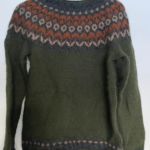 Neulottu langasta, joka kestää konepesun. 75% villaa ja 25 % polyamidia. Kuvissa on tarkemmat mitat. Arvioisin että on naisten koko M-L.