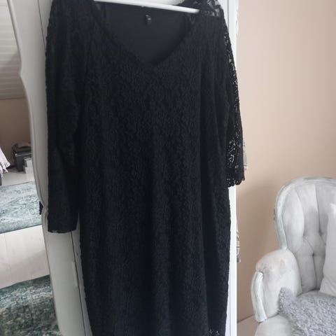 Myyntiin musta pitsimekko koko 12. Sivussa vetoketju. Selänpuolella syvempi V-leikkaus. Alushame kuuluu mekkoon.