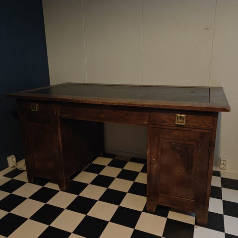 Vanha Iskun L-muotoinen työpöytä jossa saareke säädettävällä syyvyydellä. Pöydän pinnoilla ja kulmissa aja saatossa tullutta kulumaa.