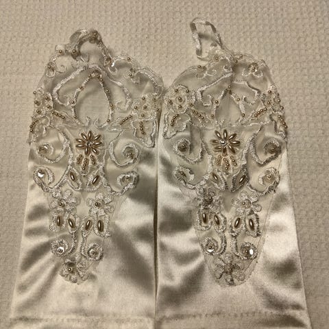 Valkoiset käsineet morsiamelle. Tuo lenkki tulee keskisormeen . Napakkaa valkoista joustavaa puuvillakangasta. Siististi ommeltu. Soveltuu parhaiten hiukan tukevampaan käteen. Ranteen max ympärys 18cm ja ranteen ja kyynerpäänvälillä max 32cm. Yksinkertainen malli. Koristele itse esim pitsein , paljetein tai helmin.