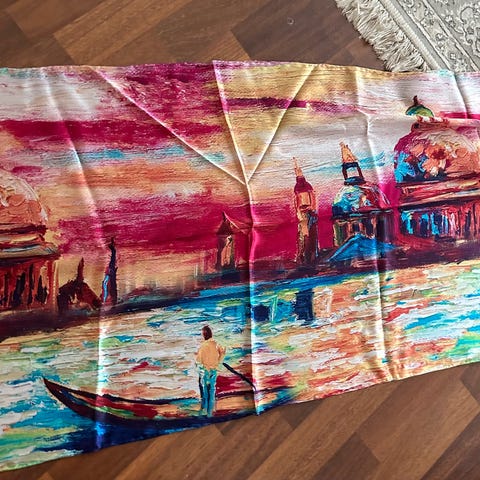 Tummanpunainen , tummansininen ja kauniin harmaan-valkokuvioinen silkkihuivi,jossa tarra 100% pure silk, made in Italy n.76x76cm. Värit ovat luonnossa kirkkaat ja hehkuvat.