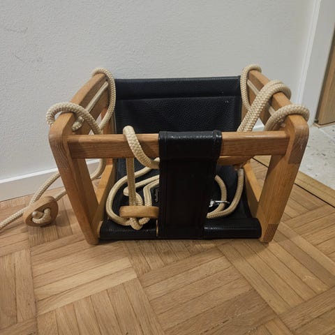 Myydään Lillagunga Toddler keinu, keinu on valkoiseksi maalattua koivua ja mustaa nahkaa.