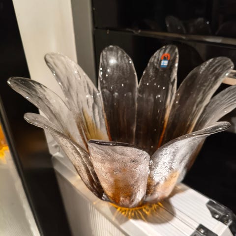 Kirkas lasimalja. Ylhäällä halkaisija n.25 cm, pohjassa 9 cm. Korkeus n. 17 cm.