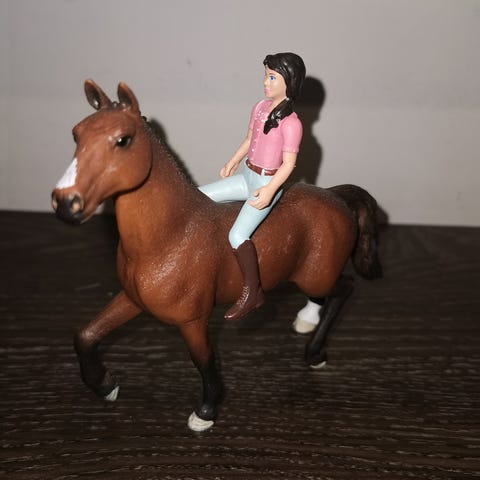 Myydään Schleich setti, jossa talli, katos, 7 hevosta, 1 ratsastaja ja pikkutarvikkeita.