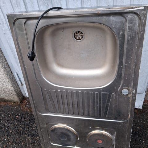 Myydään tarpeettomana kuvan mukainen tiskipöytä hanalla sekä sisältää myös kaksi sähkölevyä.