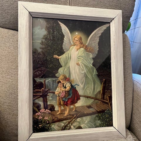 Myytävänä Raffaello Santin Kaksi enkeliä- taulu puun ja kullanvärisillä kehyksillä ja lasilla. Koko: leveys 63 ja korkeus 46 cm. Huomioithan, että enkelien väritys on vuosien saatossa haalistunut eli se ei ole enää niin vahva kuin vastaavat uudet julisteet. Taulun värisävy on lähinnä harmaa, eikä enää niin ruskean ja keltaisen sävyinen kuin uudet vastaavat.