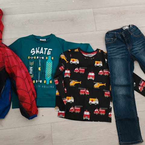 Formula-aiheinen pitkähihainen paita, Rocket league t-paita, joustavat mustat farkut ja jouluaiheinen yöpuku kokoa 122/128. Siistikuntoisia kaikki.