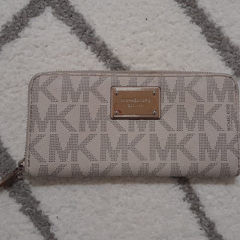 Michael Korsin lompakko/clutch. Ei montaa käytetty, joten melkein kuin uudenveroinen. (Kultaisessa laatassa pieniä naarmuja, jotka näkee läheltä katsoessa, mutta lähes huomaamattomia). Sisällä tilaa korteille, kolikoille ja kännykälle. Käsihihnan saa halutessaan pois. Mitat: L18cm x K10cm