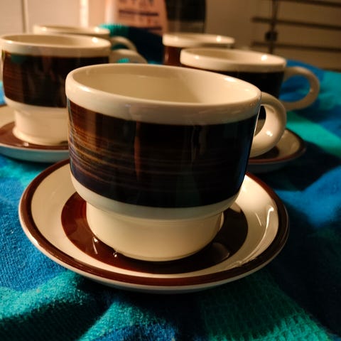 Hyväkuntoinen setti Arabian Inari sarjaa. Pienehköt sirot kahvikupit ja lautaset 5 kpl. Kupit sisältä uudenveroisia. Lautasissa käytön aiheuttamaa kulumaa. Kaikki ehjiä ja säröttömiä. Kupin korkeus 5,5 cm, halkaisija 7,3 cm, lautanen 14,2 cm. Kupin käyttötilavuus 1 dl (mitattu!). En käytä ToriDiiliä. Hinta 8 euroa on koko setille.