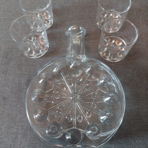 Lumitähti, karahvi ja 4 kpl snapsilaseja, karhvin korkeus 17 cm (ilman korkkia) ja lasin korkeus 4,5 cm