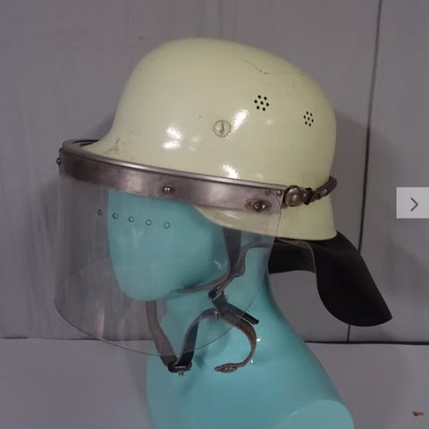 Vanha alumiininen palokypärä. Nahkainen niskasuojus mukana.